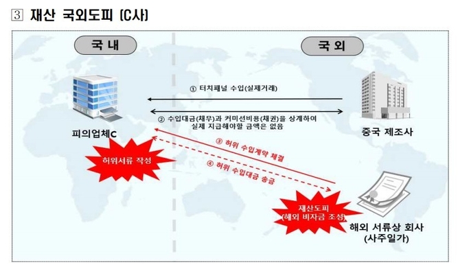 중국 제조사로부터 터치패널을 수입하던 C사는 수입대금과 커미션 채권을 상계 처리해 실제 송금할 금액이 없었다. 그럼에도 홍콩에 사주일가 명의의 페이퍼컴퍼니를 세운 뒤, 허위 수입 서류를 작성해 자금을 송금하는 방식으로 해외 비자금을 조성하다 적발됐다.