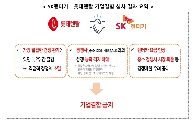 공정위는 국내 렌터카 시장의 1・2위 사업자인 롯데렌탈과 SK렌터카의 기업결합을 허용할 경우 양사 모두 사모펀드 어피니티의 지배 아래 들어감에 따라 가격 인상 등 부작용이 발생할 가능성이 높다고 판단했다.