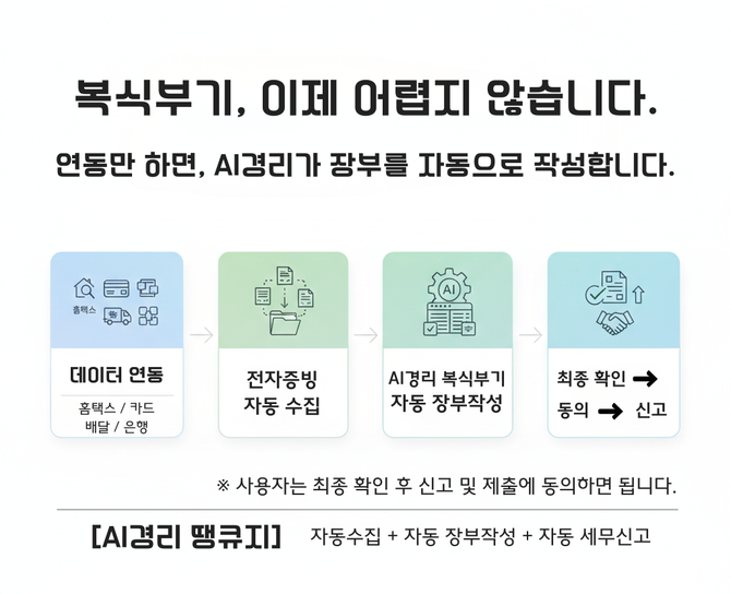최근에는 인공지능(AI)을 활용해 복식부기 장부를 자동으로 만들어주는 서비스들이 등장하며 소상공인의 고민을 해결하고 있다. 대표적인 서비스인 ‘AI경리 땡큐지’의 경우, 홈택스와 신용카드, 배달 앱, 금융 데이터 등을 연동해 모든 전자증빙을 자동으로 수집한다. AI가 수집된 데이터를 바탕으로 복식부기 장부를 작성하면, 사용자는 최종 결과만 확인하고 '동의' 버튼을 눌러 신고서 제출까지 마칠 수 있는 구조다.