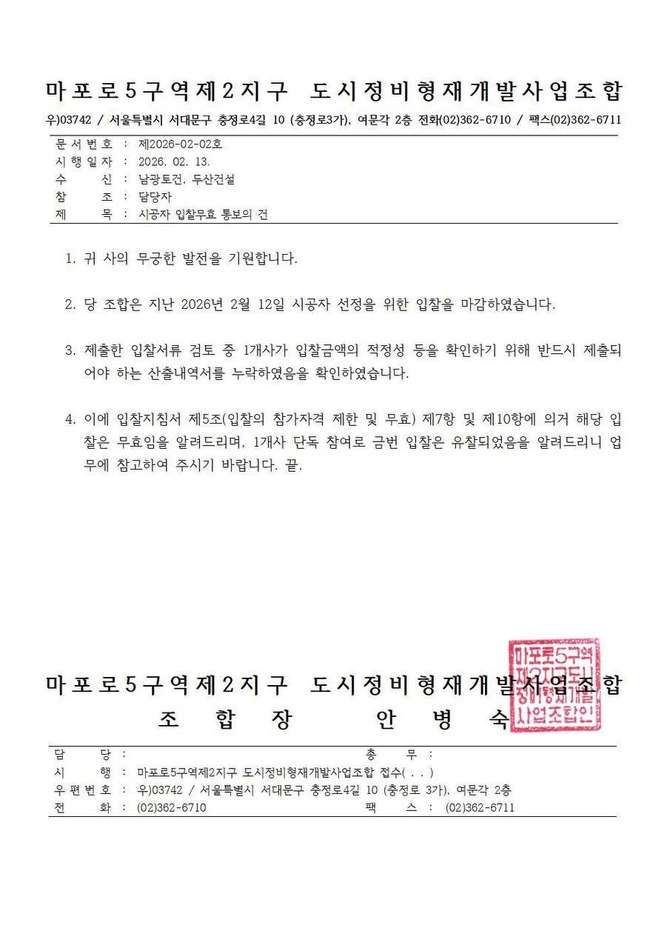 마포로5구역제2지구 도시정비형 재개발사업조합은 지난 12일 마감한 시공사 선정 입찰 결과를 검토한 결과, 제출 서류 중 일부가 누락돼 입찰을 무효 처리했다고 밝혔다.
