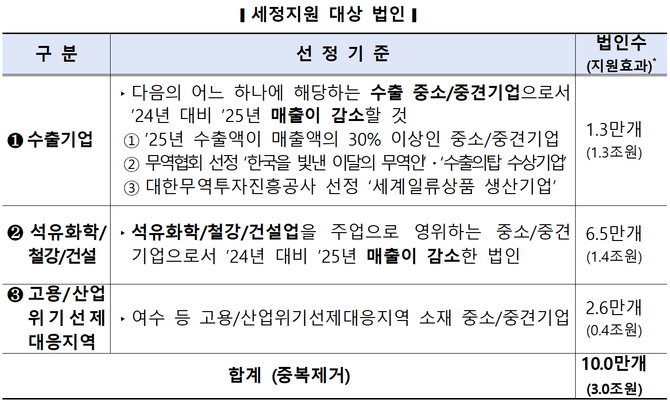 세정지원 대상은 ▲매출이 감소한 수출 중소・중견기업 ▲공급과잉 및 경기침체로 어려움을 겪는 석유화학・철강・건설업을 영위하는 중소・중견기업 ▲고용・산업위기선제대응지역 중소・중견기업이다.
