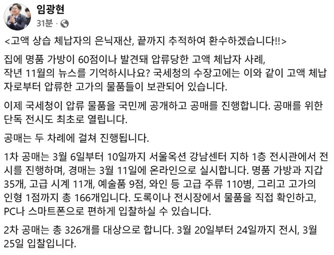 임 국세청장은 이날 자신의 페이스북에 ‘고액 상습 체납자의 은닉재산, 끝까지 추적하여 환수하겠습니다!’란 제목의 글에서 “국세청이 압류 물품을 국민께 공개하고 공매를 진행한다, 공매를 위한 단독 전시도 최초로 열린다”고 전했다.