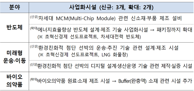 세부적으로는 차세대 MCM 소재‧부품 제조설비가 신설됐고, 에너지효율향상 반도체 설계‧제조 시설의 경우 패키징까지 적용이 확대됐다.