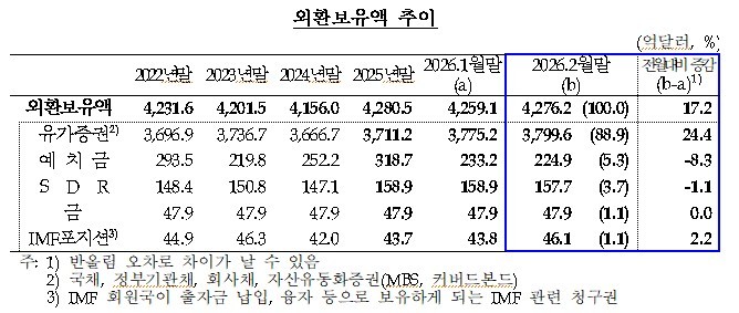5일 한국은행에 따르면 2월 말 기준 우리나라 외환보유액은 4천276억2천만달러로 전월 말(4천259억1천만달러)보다 17억2천만달러 증가했다.