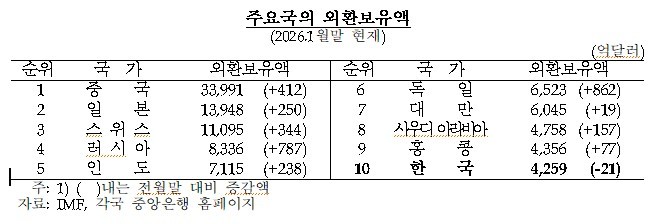 한국의 외환보유액은 1월 말 기준(4천259억1천만달러) 세계 10위 수준이다. 지난해 9월부터 12월까지 9위 수준을 유지하다가 홍콩에 밀려 한 단계 내려왔다.
