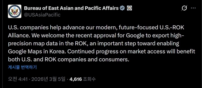 5일 미국 국무부 동아시아태평양국은 SNS를 통해 “미국 기업들은 현대적이고 미래지향적인 한미 동맹을 발전시키는 데 기여하고 있다”며 “최근 구글의 고정밀 지도 데이터 수출 승인은 한국에서 구글 지도를 활용할 수 있도록 하는 중요한 진전”이라고 평가했다.