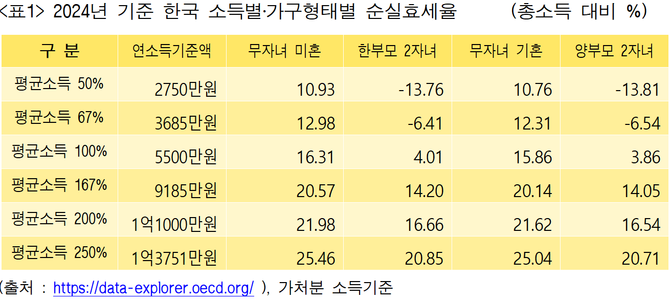아래 표1은 한국 근로소득자들의 가구유형별 순실효세율 수준이다.