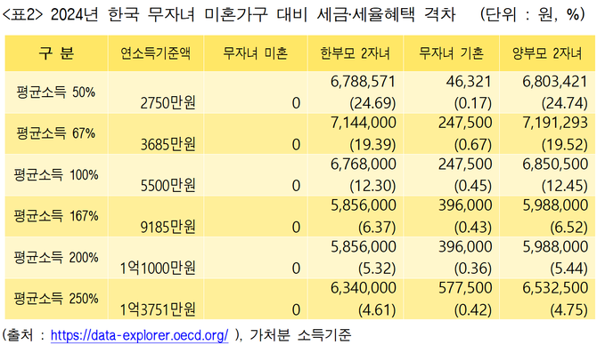 아래 표2는 같은 소득구간 내 싱글 가구보다 기혼 가구, 한부모‧양부모 2자녀 가구가 얼마나 혜택을 받는지 분석한 표다.