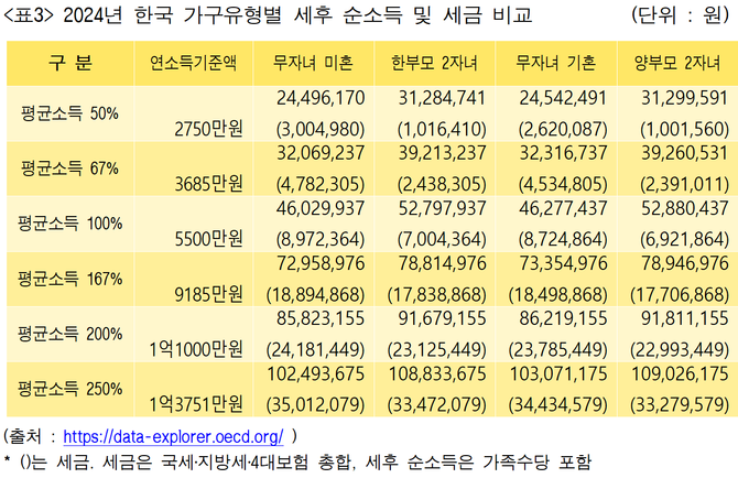표3을 보면, 현금 가족수당을 제외하고 세금제도 내에서 싱글 가구가 2자녀 가구보다 추가적으로 더 부담하는 세금은 약 150~200만원 수준이다.