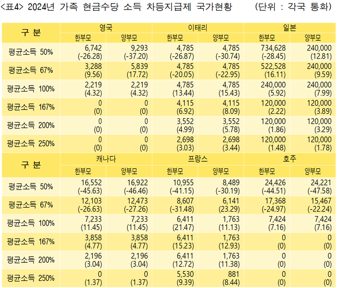 한국은 2자녀 가구에 대해 한부모‧양부모 등 가구유형과 소득수준에 상관없이 연 480만원의 현금 가족수당을 일괄 지급한다.