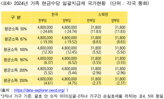 한국과 스웨덴은 가족 현금수당 지급하는 방법이 똑같다 뿐이지 양국의 조세제도는 현격한 차이가 있다.
