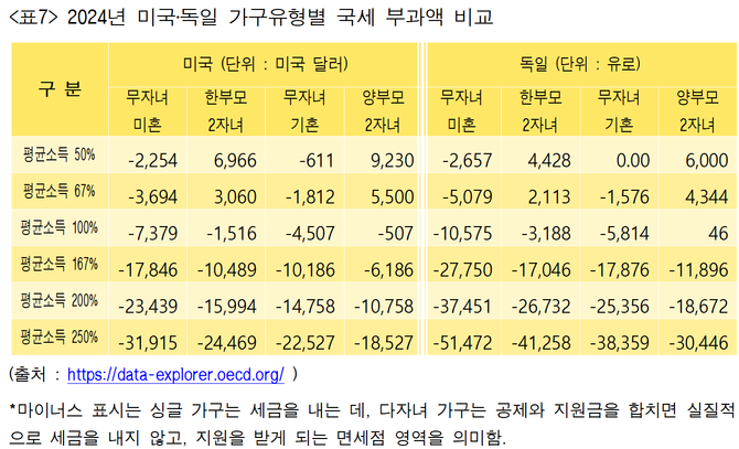 독일도 비슷하다. 평균소득 50% 구간의 싱글 가구 대비 국세 차이는 2자녀 가구의 경우 7348유로(한부모)~8920유로(양부모)이며, 기혼 가구는 2657유로를 싱글 가구보다 덜 부담한다.