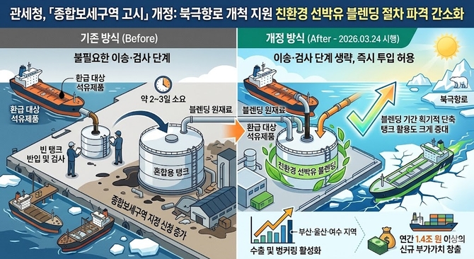관세청은 이번 규제 완화가 탱크 시설이 집중된 부산, 울산, 여수 지역의 블렌딩 활성화로 이어질 것으로 보고 있다. 최근 북극항로 개척 수요와 맞물려 오일탱크 추가 건설 및 종합보세구역 지정 신청이 급증하고 있는 만큼, 적시에 내놓은 규제 혁신이라는 평가다.