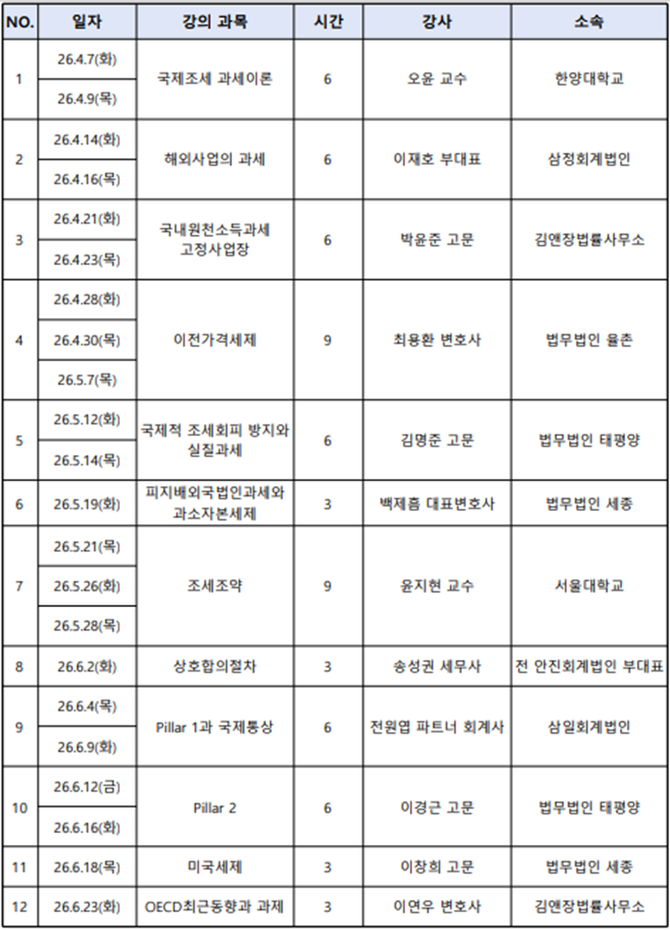 강사진은 실무‧이론을 겸비한 국제조세전문가 12명을 강사진으로 구성되며, 장소는 삼일회계법인 AP17층 1코어 세종홀, 교육시간은 매회 오후 7~10시다.