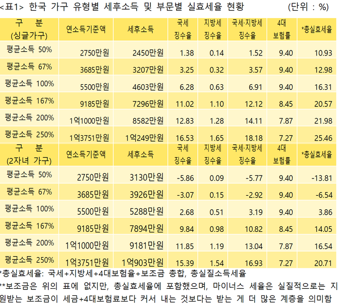 싱글 가구의 경우 총실효세율은 10.93~25.46%, 2자녀 가구의 경우 –13.81~20.71%다.