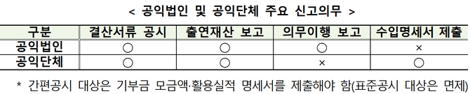 제출 대상은 재무제표 및 그 주석 등 결산서류, 기부금활용실적 명세서, 출연재산 등에 대한 보고서, 의무이행 보고, 수입명세서다.