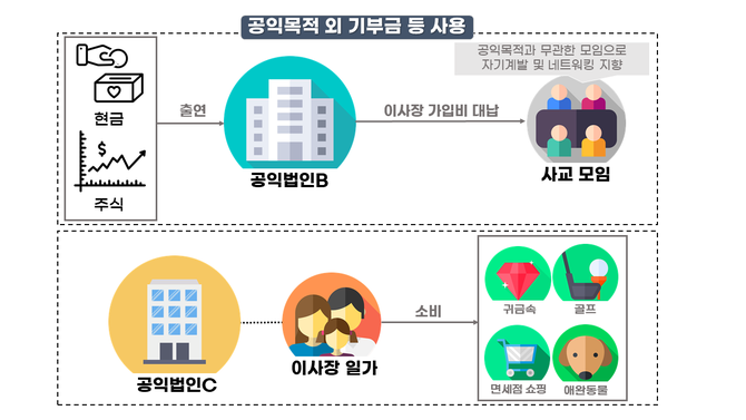 공익법인 B는 공익목적보다는 사교 목적으로 운영되는 모임의 수백만원 상당 가입비를 이사장 사비 대신 기부금 등 공익법인 자금으로 대납했다.
