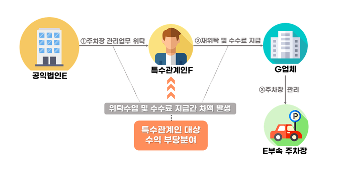 특수관계인 F는 G업체에 주차장 관리를 재위탁하여 G업체가 특수관계인 F를 대신하여 주차장을 실제로 관리하게 했다. 쉽게 말해 실제 운영업체 중간에 특수관계인 업체를 끼워 넣어 통행세를 챙기게 했다.