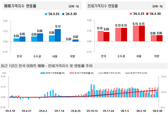한국부동산원 주간 아파트가격 동향에 따르면 전국 전세가격은 0.09%, 서울은 0.15% 상승했다. 같은 기간 매매가격은 전국 0.05%, 서울 0.12%였다. 전세 상승폭이 매매보다 더 크게 나타난 것이다. 수도권으로 좁혀도 전세 0.13%, 매매 0.08%로 동일한 흐름이 확인된다.