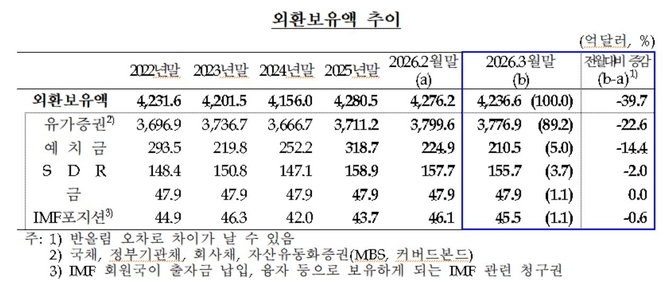 3일 한국은행에 따르면 3월 말 기준 우리나라 외환보유액은 4천236억6천만달러(약 641조원)로, 전월보다 39억7천만달러 뒷걸음쳤다.