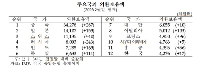 한국의 외환보유액 규모는 2월 말 기준(4천276억달러)으로 세계 12위 수준이다. 1월 10위에서 한 달 사이 두 계단 떨어졌다.