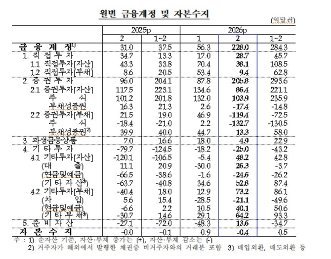 금융계정 순자산(자산-부채)은 2월 중 228억달러 불었다. 직접투자의 경우 내국인의 해외투자가 38억1천만달러, 외국인의 국내 투자는 9억4천만달러 각각 증가했다.