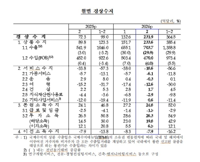 2월 경상수지를 항목별로 보면, 상품수지 흑자(233억6천만달러) 역시 작년 동월(89억8천만달러)의 2.6 배로 역대 가장 많았다. 수출(703억7천만달러)은 1년 전보다 29.9%나 늘었다. 설 연휴에 따른 조업일수 감소에도 불구하고 반도체 등 정보기술(IT) 품목의 수출 호조가 이어졌기 때문이다.