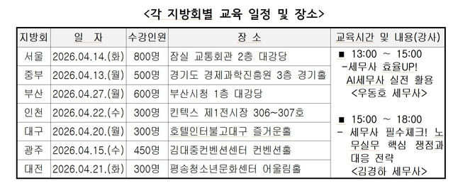 한국세무사회는 오는 4월 13일부터 전국 7개 지방세무사회별로 ‘2026년 4월 회원희망교육’을 실시한다고 밝혔다.