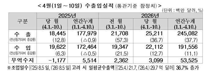 관세청이 13일 발표한 '2026년 4월 1일~10일 수출입 현황'에 따르면, 이 기간 수출액은 252억 1,100만달러로 지난해 같은 기간보다 36.7%(67.7억 달러) 증가했다. 이는 매달 1~10일 통계 기준 종전 최고치였던 지난달(217억 달러)의 기록을 불과 한 달 만에 경신한 역대 최대 규모다.
