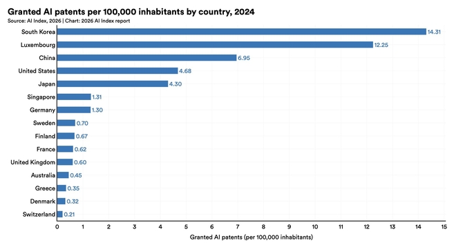 13일(현지시간) 스탠퍼드대 인간중심AI연구소(HAI)의 '2026 AI 지표' 보고서에 따르면 한국은 지난 2024년 기준 인구 10만 명당 AI 특허 건수가 14.31건으로 룩셈부르크(12.25건), 중국(6.95건), 미국(4.68건), 일본(4.3건)을 제치고 세계 1위를 기록했다고 연합뉴스는 전했다.