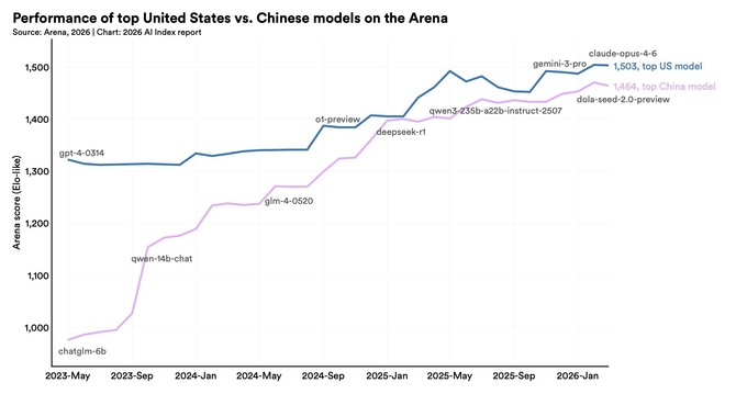 보고서는 미국과 중국의 AI 모델 성능 격차가 사실상 사라졌다고 분석했다. 지난 2023년 미국 최상위 모델과 중국 최상위 모델의 점수 격차는 300점 이상의 차이를 보였지만, 올해 3월 기준 미국 최상위 모델인 앤트로픽의 '클로드 오퍼스4.6'(1천503점)과 중국 최상위 모델 '돌라-시드-2.0 미리보기'(1천464점) 간 격차는 불과 39점이었다는 것이다.