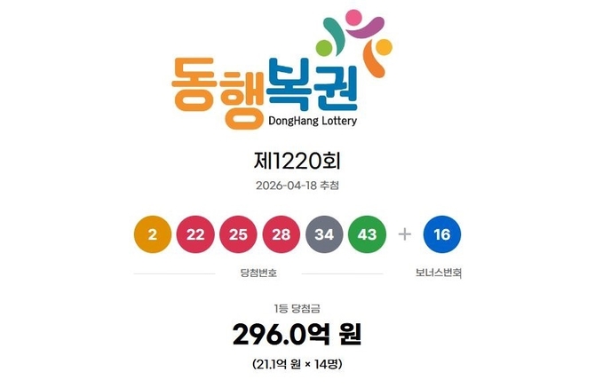(조세금융신문=김종태 기자) 제1220회 로또복권 추첨에서 '2, 22, 25, 28, 34, 43'이 1등 당첨번호로 뽑혔다. 2등 보너스 번호는 '16'이다.