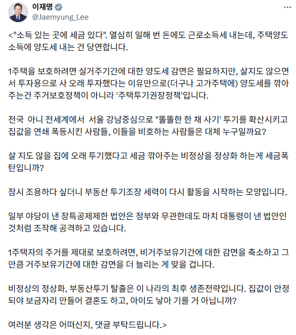 이러한 가운데 이재명 대통령은 24일, 자신의 엑스(X·옛 트위터)에 글을 올려 “실거주 기간에 대한 감면이 필요하다”고 밝혔다. 최근 장특공을 둘러싼 논란이 이어지는 가운데 직접 입장을 밝힌 것으로 풀이된다. 단순 보유 기간이 아닌 실제 거주 여부를 기준으로 세제 혜택을 재설계할 필요가 있다는 취지로, 장특공 제도의 기준 변화를 시사한 발언으로 해석된다.