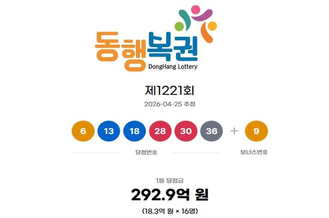 (조세금융신문=김종태 기자) 제1221회 로또복권 추첨에서 '6, 13, 18, 28, 30, 36'이 1등 당첨번호로 뽑혔다. 2등 보너스 번호는 '9'이다.