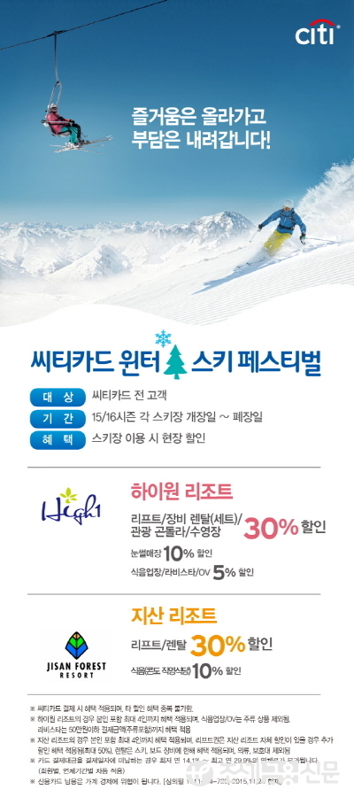 씨티카드는 또 전 고객을 대상으로 오는 15/16 스키 시즌 하이원 리조트, 지산 리조트 이용 시 현장 할인 혜택도 제공한다.