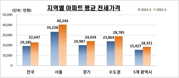 또한 수도권의 경우 2016년 3월 아파트 평균 전세가격이 2억 8,785만원으로 2월 수도권 평균(2억8,609만원)보다 176만원(0.62%) 올랐다. 전국적으로는 2억 2,647만원으로 2월 평균 전세가격(2억2,521만원) 보다 126만원(0.56%) 상승했다.