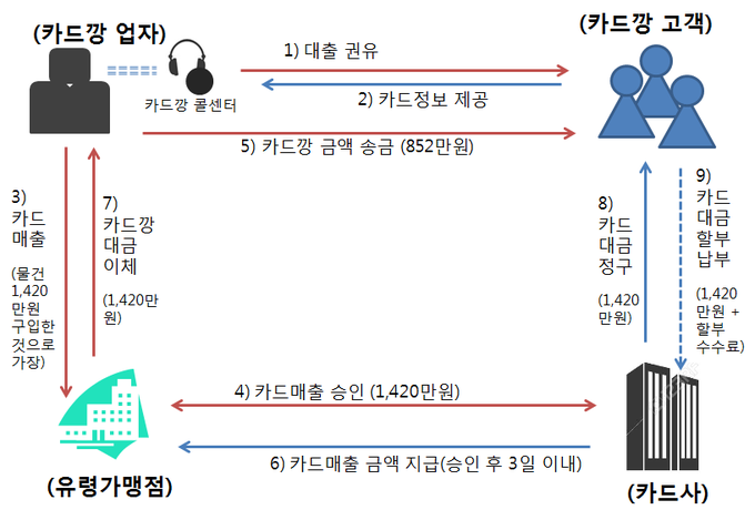 금감원 관계자는 "카드깡은 이용 금액의 1.7배를 상환해야 하는 불법사금융이므로 사용하지 말아야 한다"며 "카드번호와 CVC번호(카드 뒷면 보안코드) 등 카드정보를 요구하는 업체는 불법사금융 업체일 가능성이 높으므로 철저한 확인이 필요하다"고 강조했다.