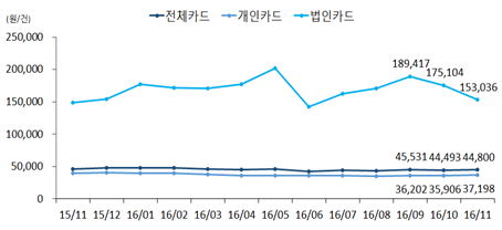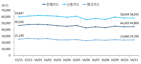 2016년 11월 전체 신용카드 평균결제금액은 4만4800원으로 지난 2015년 11월에 비해 3.8% 줄었다. 공과금을 뺀 전체 신용카드 평균결제금액도 작년 11월보다 5.0% 하락한 4만1239원인 것으로 나타났다.