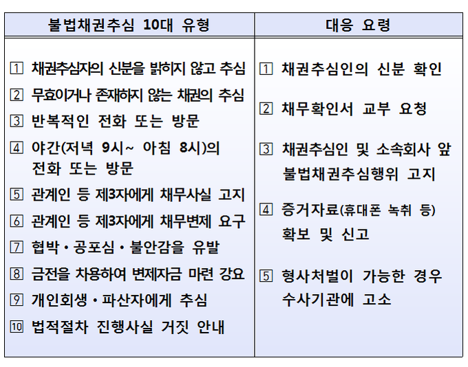채권추심자의 신분을 밝히지 않고 추심, 무효이거나 존재하지 않는 채권의 추심, 반복적인 전화 또는 방문, 제3자에게 채무사실 고지 등이 주요 불법 유형이다.