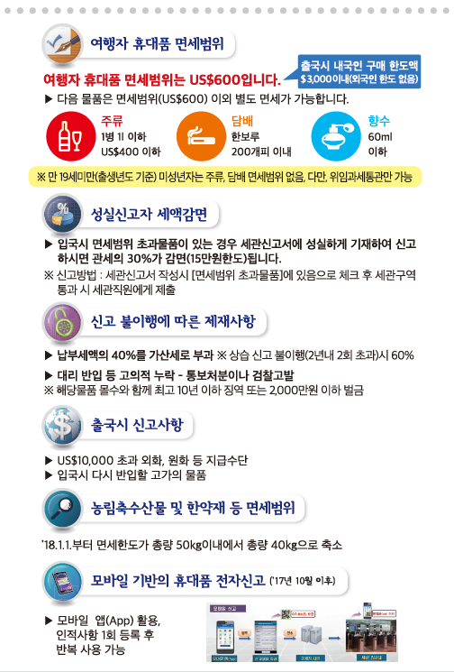 해외여행자는 입국 시 관세법 96조에 따라 면세점과 해외 구매품목을 모두 합산해 미화 600달러 범위 내에서 관세를 면제받을 수 있다. 또 ▲술(1병) ▲담배(1갑) ▲향수(60㎖)에 대해서는 기본 면세범위와는 관계없이 관세를 면제받는다.