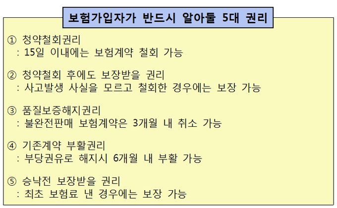 먼저 보험 가입자는 보험증권을 받은 날부터 15일 이내에 아무런 불이익 없이 계약을 철회할 수 있다. 보험사는 철회 신청을 받은 날부터 3일 이내에 보험료를 돌려줘야 하고 지연되면 이자까지 줘야 한다.