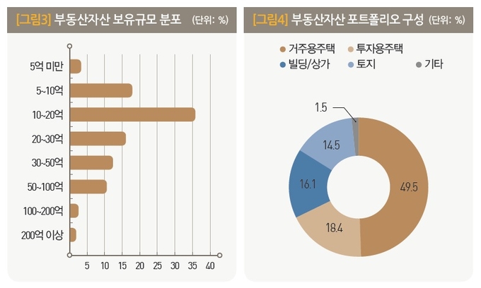 한국 부자들의 부동산자산은 거주용 외 투자용주택‧아파트‧오피스텔(18.4%), 빌딩‧상가(16.1%), 토지(14.5%) 등 투자용 부동산 비중이 50.5%를 차지했고 거주용주택‧아파트‧오피스텔은 49.5%였다.