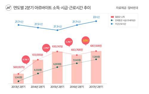 올해 2분기 아르바이트생들은 주 평균 22시간 근무했으며, 한달 평균 68만7000원 정도를 번 것으로 조사됐다.