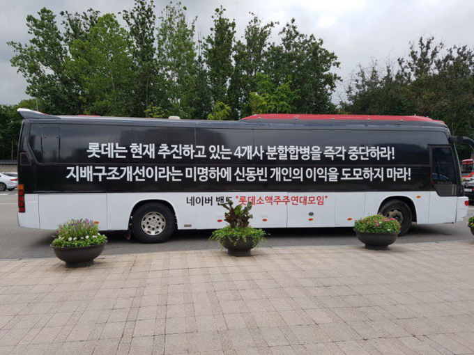 롯데소액주주연대모임은 "서울 시내에 분할합병 반대 문구가 적힌 홍보 버스 2대를 17일부터 28일까지 운행할 계획"이라고 18일 밝혔다.