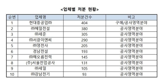 업체별로는 현대중공업이 404건으로 가장 많은 처분을 받았다. 뒤를 이어 혜일전설 380건, 주식회사 세준 305건, 서광이엔씨 290건, 영전사 205건 등 주요 업체가 중복해서 처분을 받았다.