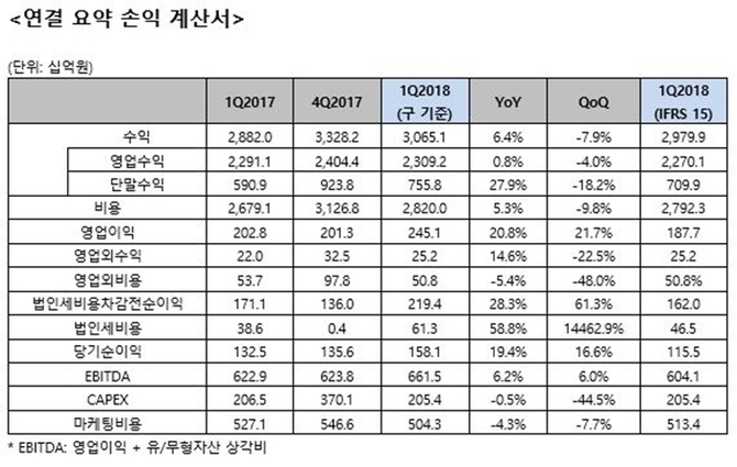 이는 올해부터 새로운 회계기준이 적용됐기 때문이다. 새 회계기준 적용에 따라 과거 단말수익과 서비스수익에서 각각 차감된 단말지원금과 요금할인이 하나의 거래로 간주돼 단말수익과 요금수익 비율로 안분 차감됐다.
