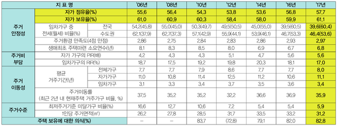 자가 점유율은 2017년 자가에 거주하는 가구는 전체 가구의 57.7%로 2016년 56.8%에 비해 0.9%p 증가하였다. 지역별로는 모든 지역에서 2016년에 비해 상승한 것으로 나타났으며 소득계층별로는 저ㆍ중소득층은 2016년에 비해 소폭 증가한 반면 고소득층은 정체된 것으로 나타났다. 자가 보유율은 2016년 59.9%에서 2017년 61.1%로 1.2%p 증가하였다.
