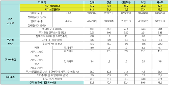 앞서 살펴본 주거실태조사 주요지표를 보다 구체적으로 청년가구, 신혼부부, 노인 가구, 저소득층 등으로 구분하여 특성가구별 지표를 살펴보면 다음과 같다.