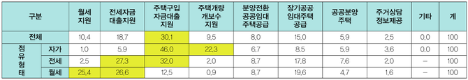 주거지원이 필요하다는 가구를 대상으로 가장 필요한 주거지원 프로그램을 조사한 결과, 주택구입자금 대출지원이 30.1%로 가장 높게 나타났다. 자가가구는 주택구입자금 대출지원이 46.0%, 주택개량·개보수지원이 22.3%, 전세가구는 주택구입자금 대출지원이 32.0%, 전세자금 대출지원이 27.3%, 월세가구는 전세자금 대출지원이 26.6%, 월세보조금 지원이 25.4%로 가장 필요로 하는 것으로 나타났다.