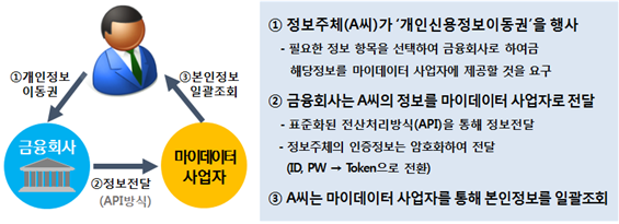 대신 금융위는 금융회사가 고객의 정보를 마이데이터 사업자에게 직접 전달하는 방식으로 개선한다. 정보 전달은 표준화된 전산처리방식(API)을 통해 이뤄지며 이 과정에서 정보 주체(고객)의 인증 정보는 암호화 처리된다. ID와 패스워드를 토큰으로 저장한 후 토큰을 주기적으로 변경·삭제하는 등의 방식을 활용할 예정이다.